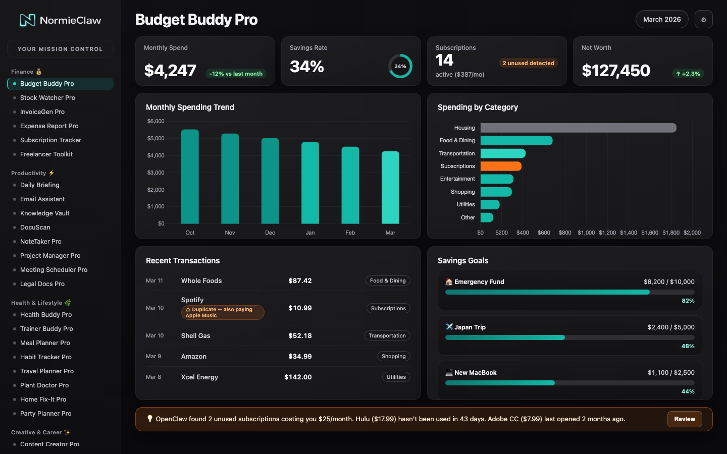 Stop bouncing between apps. Your Dashboard Builder creates a single, centralized hub where every NormieClaw tool feeds its data. Budget trends, meal plans, workout history, inbox summaries, security scans — all in one place. Your personal operating system, customized exactly how you want it.